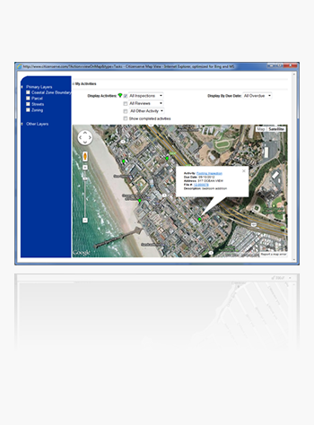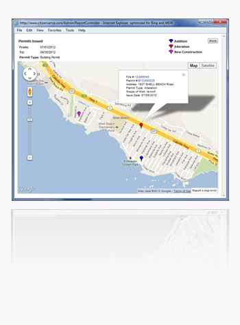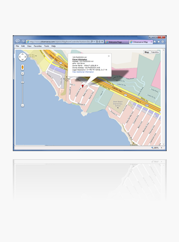 Citizenserve utilizes google maps integrated with your gis data to provide fast, easy to use maps. Use maps to look up property information, import parcel data into your files, view your inspections due on a map and run your reports in a map format to get a geographical view of your data. As with all citizenserve components your user subscription provides full access to the Mapping component without any additional fees.