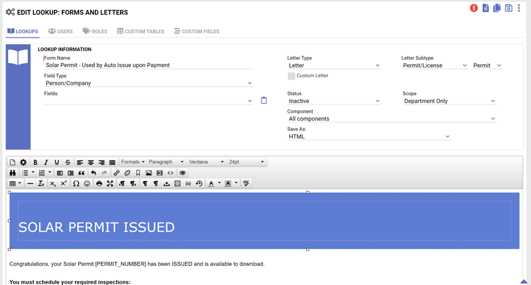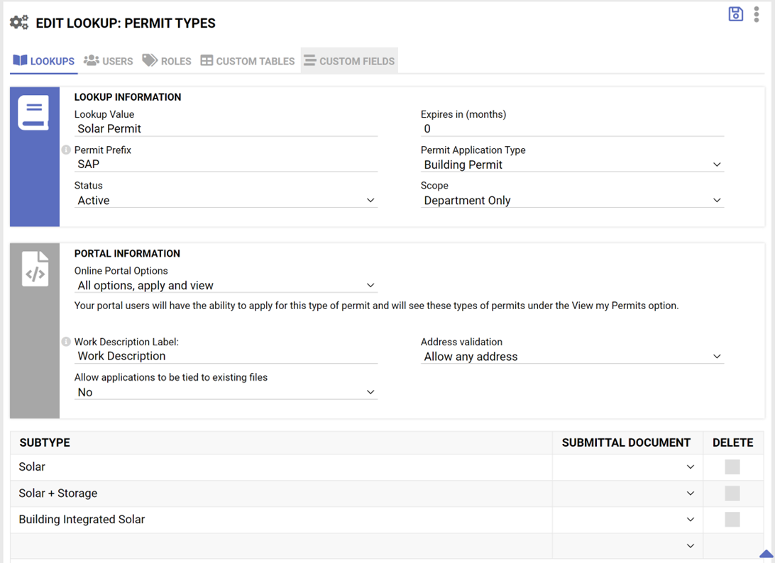 - Save the new permit type. Once saved, open the lookup for the permit type to finish the configuration